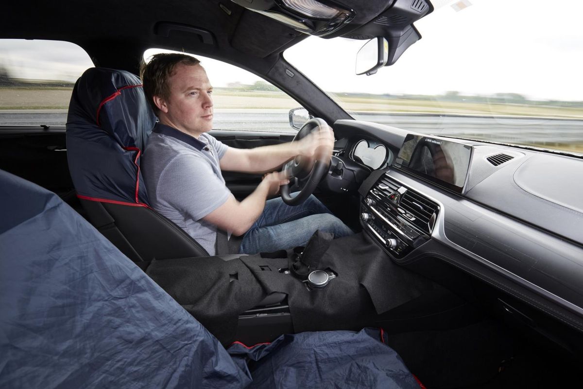 The interior of the prototype was covered up for the most part, but the usual M trinkets are present and correct, including a lovely new steering wheel with repositioned M1 and M2 buttons, gorgeous bucket seats trimmed in leather and a chunky new gear selector with the Drivelogic toggle switch built in. The instruments have been restyled too and the centre console is a little different to that of the regular 5 Series.