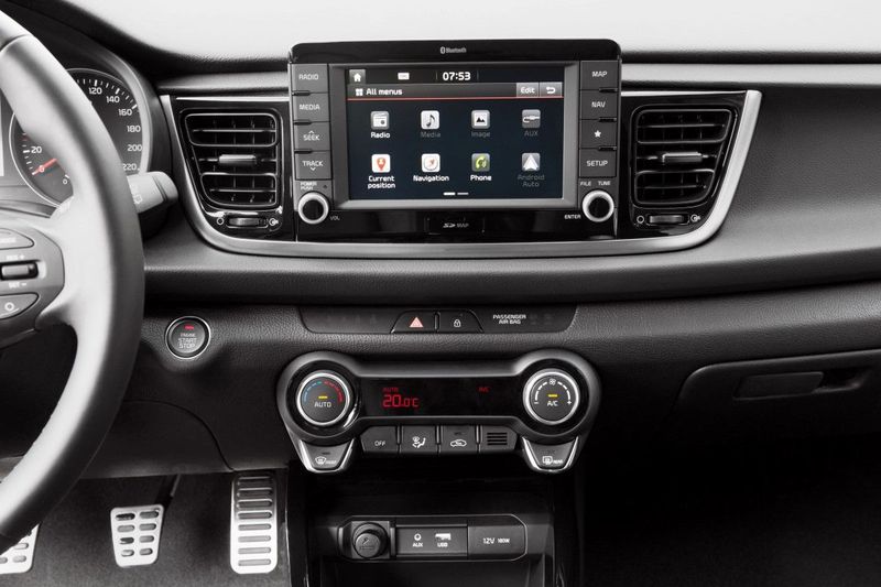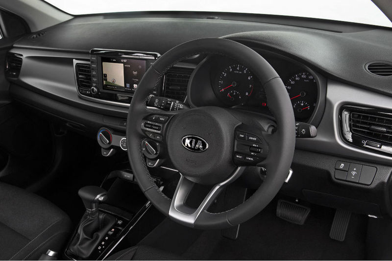 A selection of black materials and trim give the Rio's cabin a businesslike ambience. Note the tablet-like touchscreen interface.