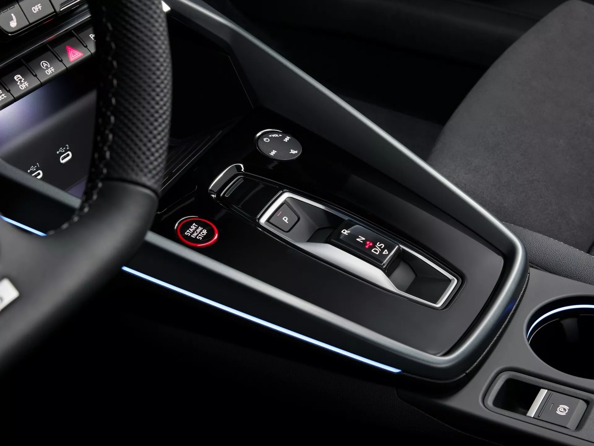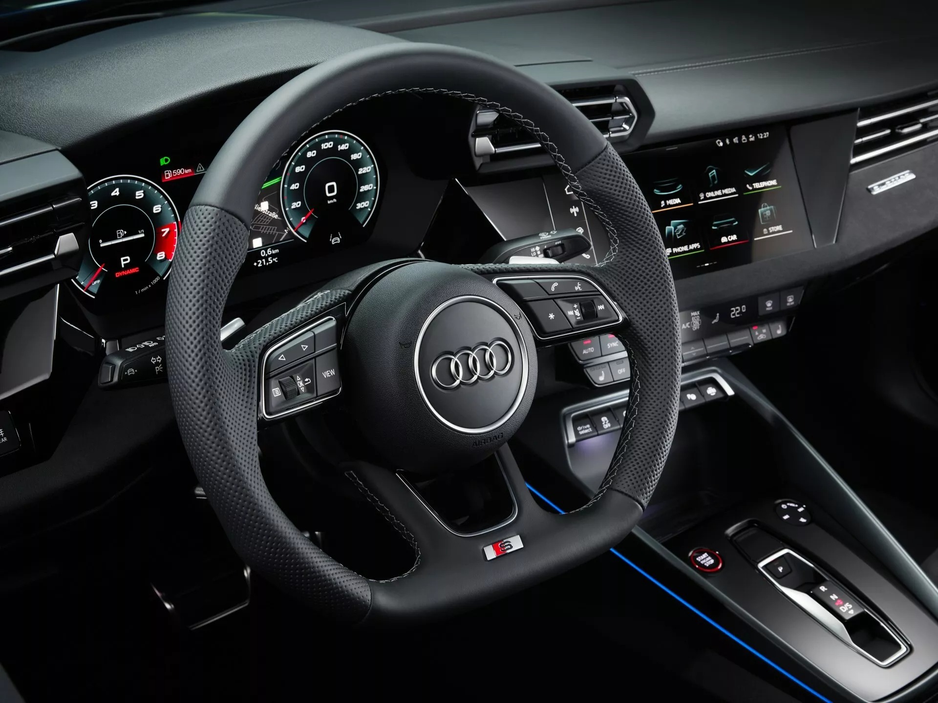 Compared with its pre-facelift predecessor, the 2025 Audi S3‘s cabin has updated ambient lighting, a redesigned transmission lever, laser-cut illuminated fabric panels in the doors and new textured inlays available in either aluminium or carbon fibre. A black headlining, stainless steel pedals, illuminated door sills, and a contoured flat-bottomed leather steering wheel underline the sporty atmosphere.