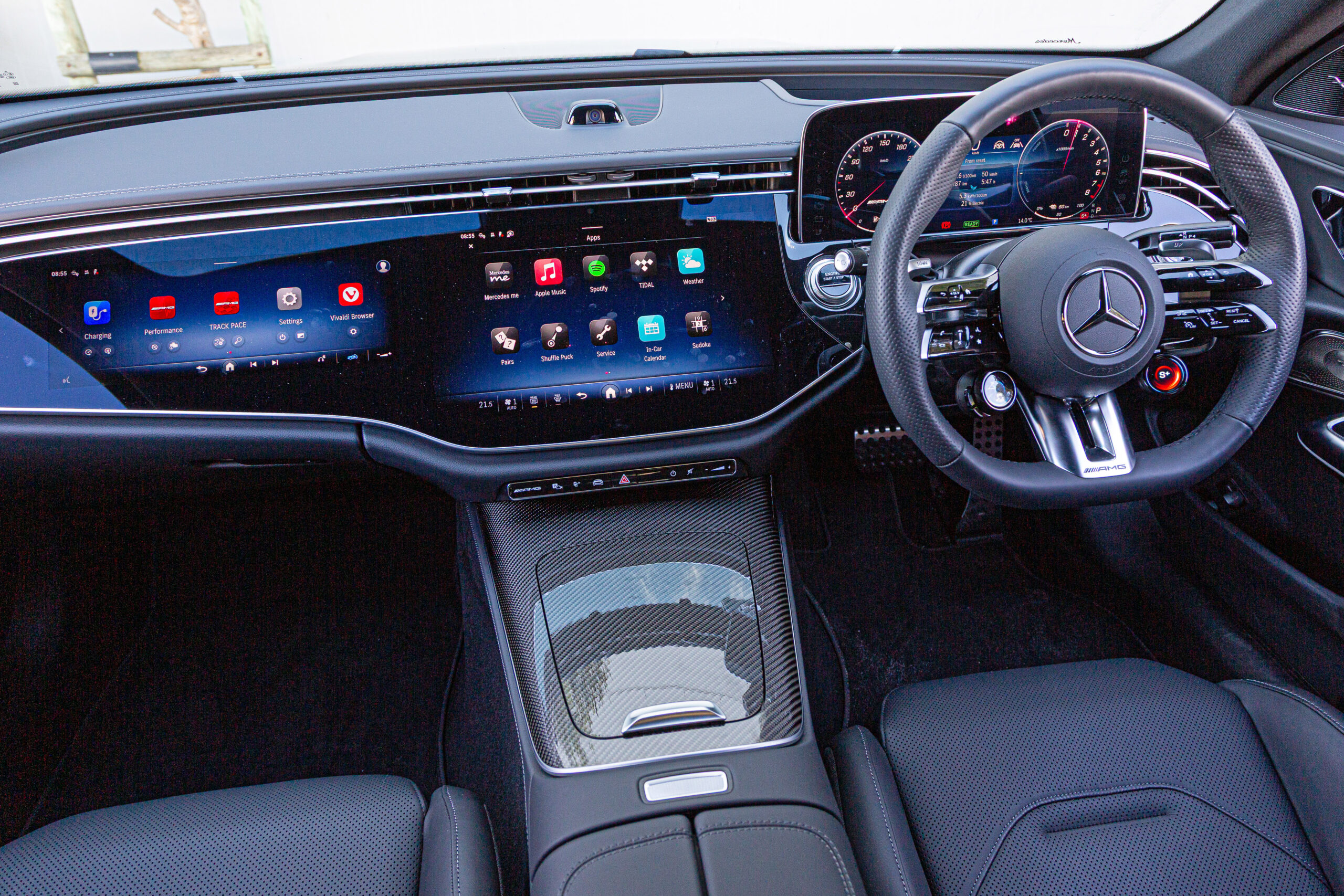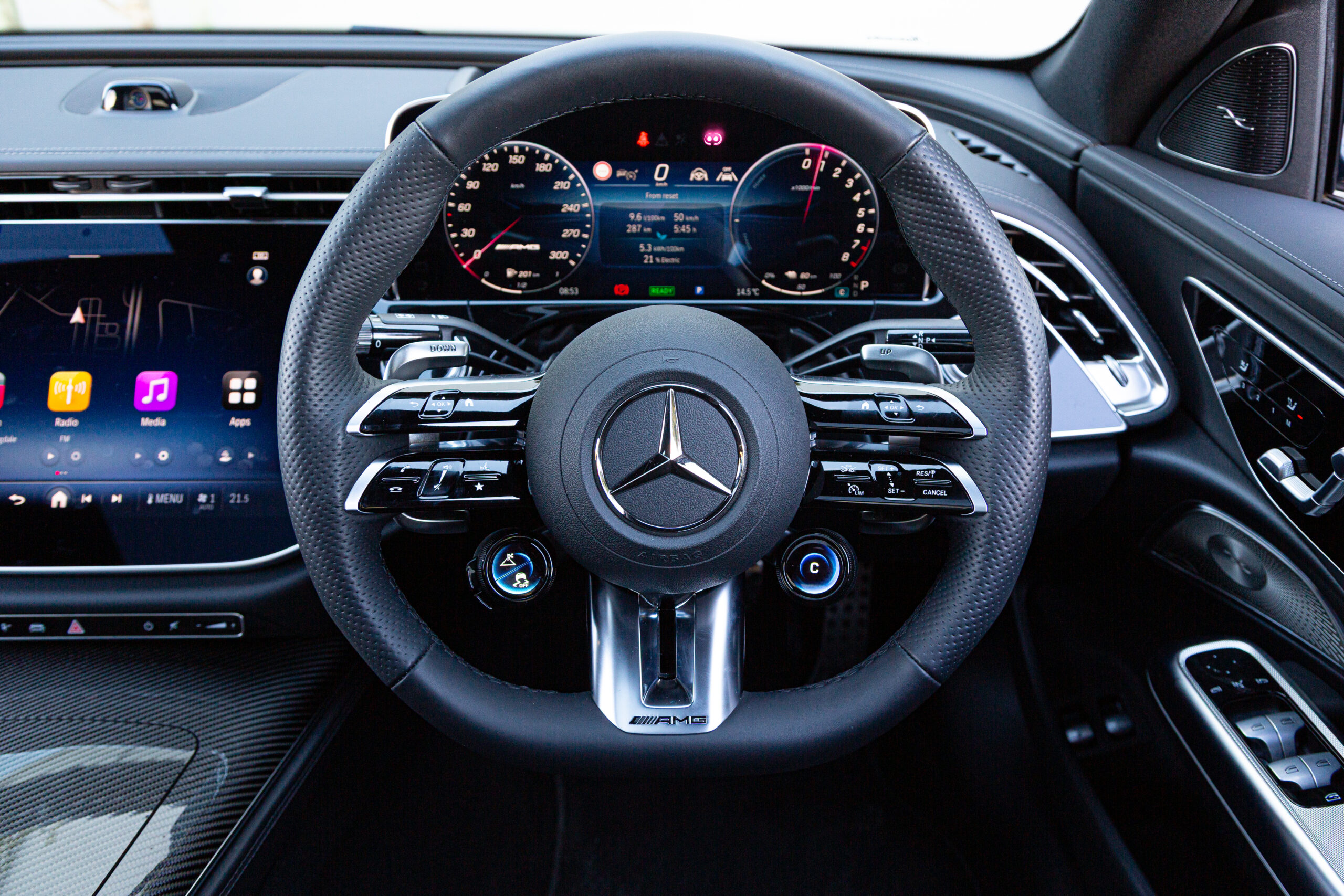 The AMG steering wheel has jog wheels for quick access to drive modes and performance settings.