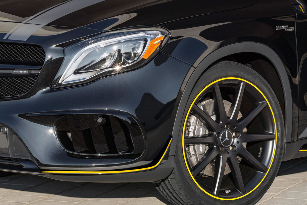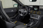 Customers looking to go all-out in terms of beefing up the styling of the AMG GLA45 might want to consider the AMG Performance Studio Package, which includes a body painted in either Night Black or Cosmos Black with a combination of Matte Graphite Grey and Yellow sections. Light alloy wheels in matte black with yellow rim flanges are fitted and the AMG twin louvre on the radiator grille is painted in black. Yellow accents are seen on the front bumper, side mirrors, side skirt inserts, rear diffuser and on the rear wing. The aggressive look is further emphasised by AMG sport stripes in matte graphite grey on the bonnet, roof, boot lid and along the side of the car.