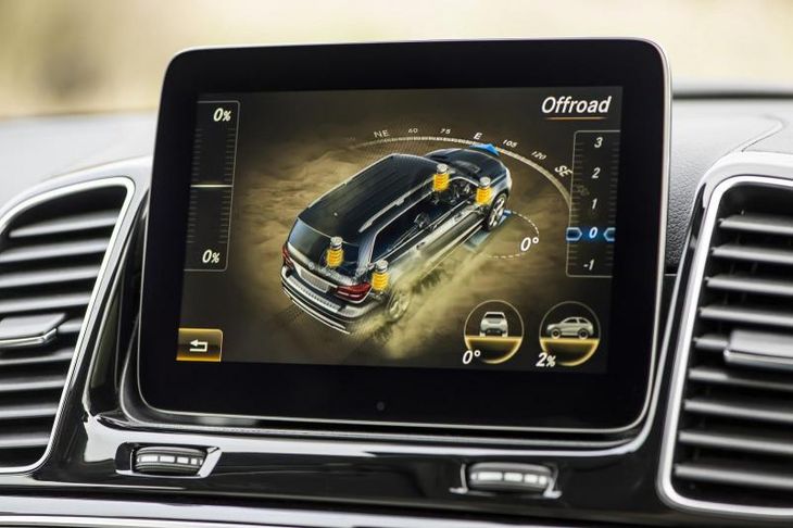 Each driving mode comes with its own fancy graphic. Here, Offroad mode is in action, showing ride height, geographic direction, pitch and lean data.