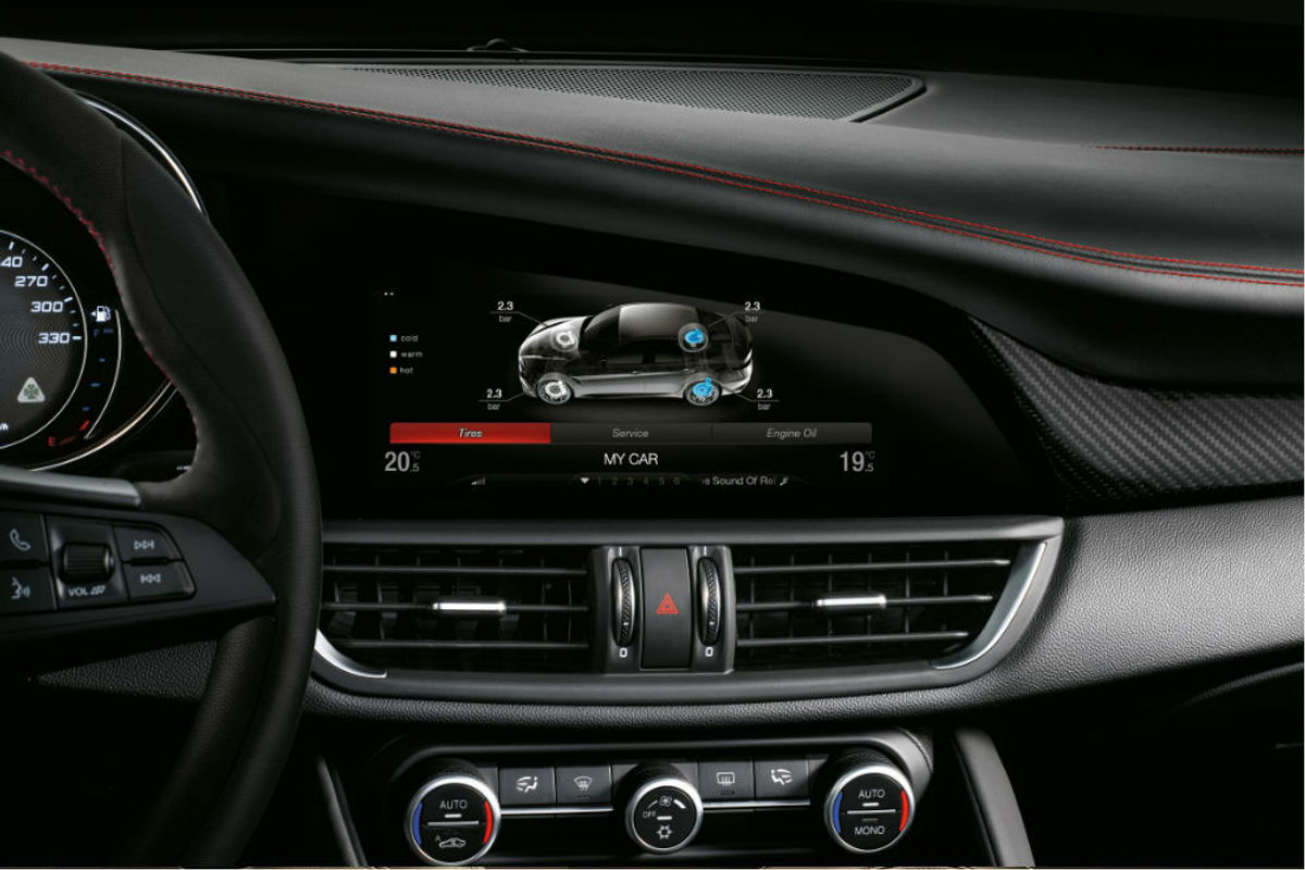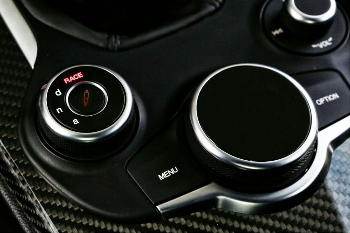 The Quadrifoglio's interior is overtly sporty, replete with a motorsport-inspired steering wheel and swathes of carbon fibre.