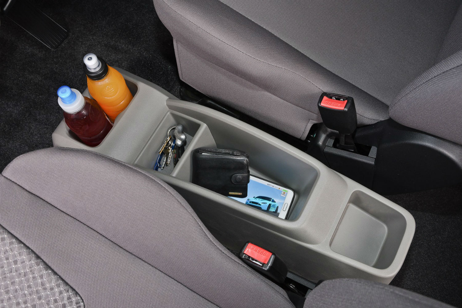With the gear lever and handbrake mounted on or under the fascia, the space between the front seats features a convenient storage unit.