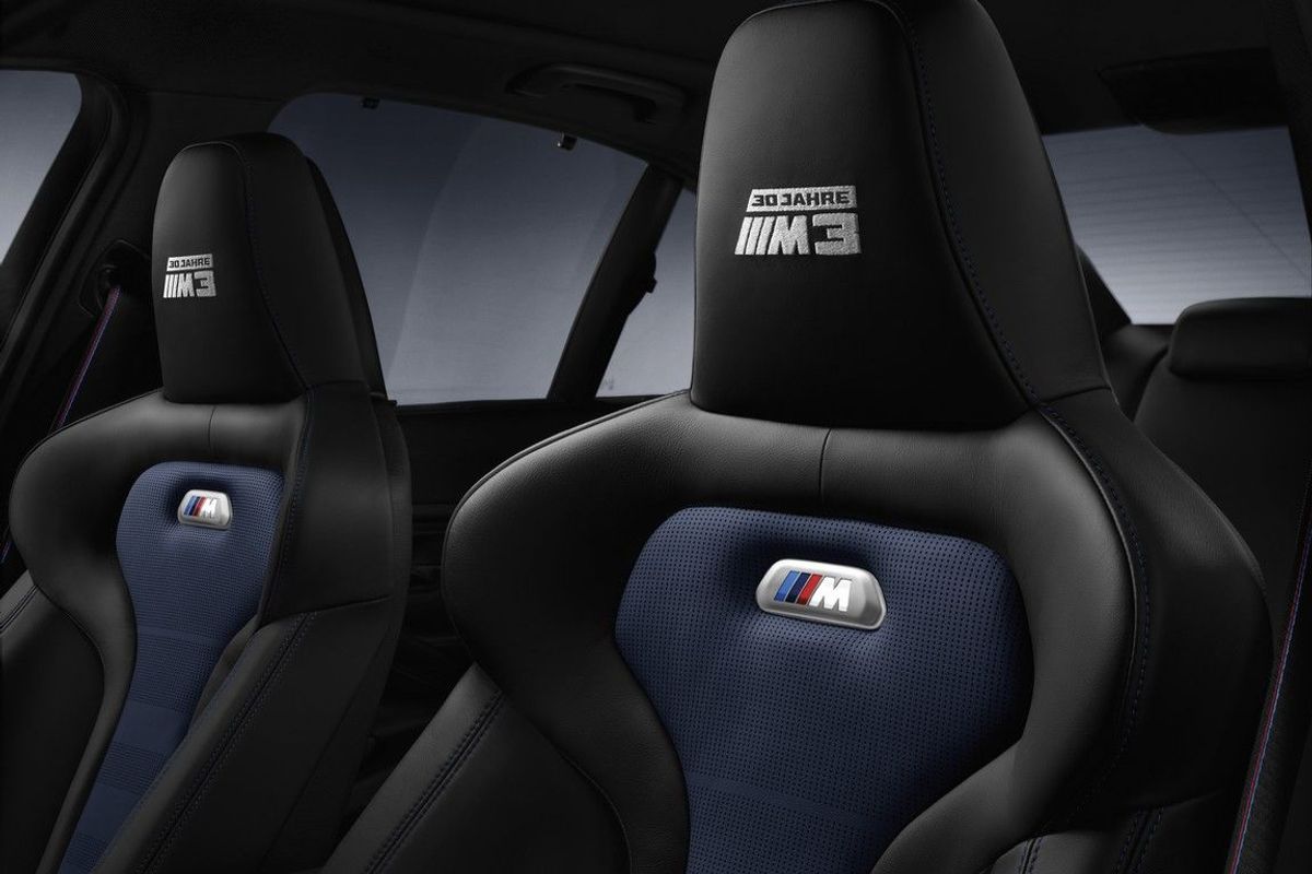 The interior gains some classy touches in the form of M sports seats in a skeletal design and seatbelts with woven-in BMW M strips also enhance the sporty interior ambience. There are plenty of 30 Years M3 logos dotted around the cabin such as on the doorsills and headrests, and a 30 Years M3 1/500 badge on the carbon fibre interior trim strip of the instrument panel to remind you that you're driving something special.