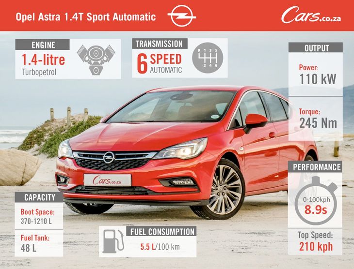 The Opel Astra 1.4T Sport Auto costs R374 000, which includes a 5-year/120 000 km warranty and a 5-year/90 000 km service plan. Service intervals are at every 15 000 km.