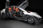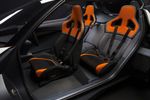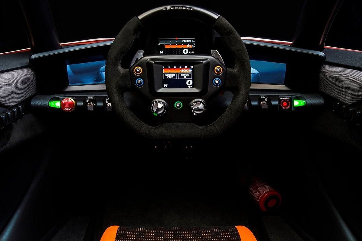 Here are some more details: there's special cooling for the battery and motors; the cabin has an uncommon three-person layout (first seen on the McLaren F1 supercar): the driver sits front and centre, with a pair of passengers behind them; and the sporty, supportive seats feature 4-point safety harnesses.