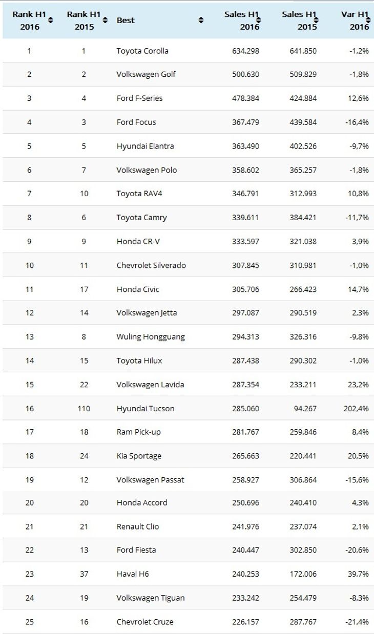The Ford Focus joins the list at fourth place with 367 479 sales and Hyundai’s Elantra cracks fifth place with 363 490 sales in the first half of the year. Another car from Hyundai that's showing significant gains is the recently introduced Tucson, which jumped 94 places and is currently placed 16th with 285 060 sales so far.