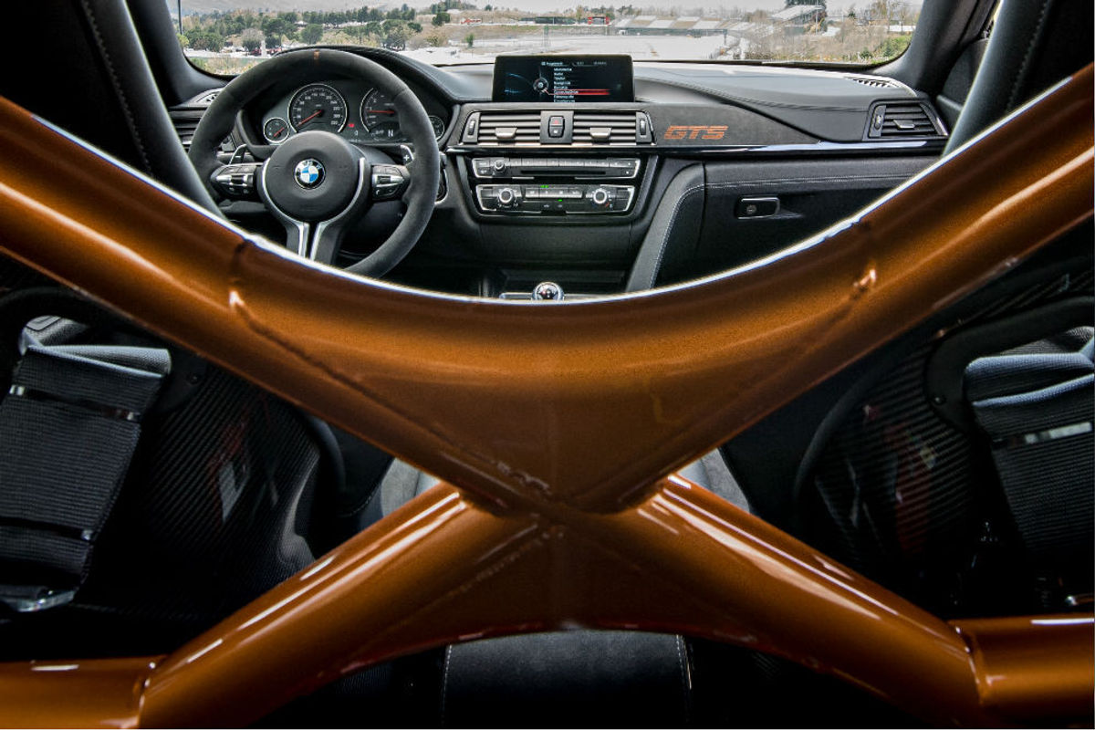 The GTS isn’t shy then, and continuing the theme are the busy looking alloy wheels, shod with Michelin Pilot Sport Cup tyres and partly painted in Acid Orange lacquer. If you do (somehow!) manage to miss the sight of the car, then you’ll certainly hear it. A standard M4 is hardly a quiet machine, but the GTS has the measure of it. Titanium exhausts not only shed a few useful kilograms from the GTS’ kerb weight (1 585 kg), but also give the über M4's engine a harder, edgier note. There are more options, of course: you can drop the unsprung mass by another 7 kg by opting for carbon-fibre rimmed wheels and then there’s the Clubsport package, which includes a cage and super lightweight carbon-fibre front seats equipped with 6-point racing harnesses.