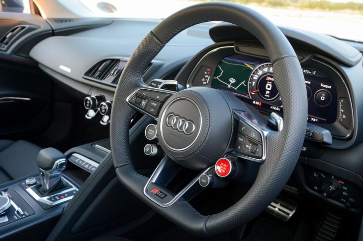 Audi’s virtual cockpit sits in the instrument cluster and can be easily adjusted to your choice of what needs to be displayed. It’s a familiar interior with the odd smattering of Alcantara or carbon fibre to remind you that you are sitting in a supercar. The seating position feels better than that of its Huracan cousin and its array of sensible switchgear is more appealing.