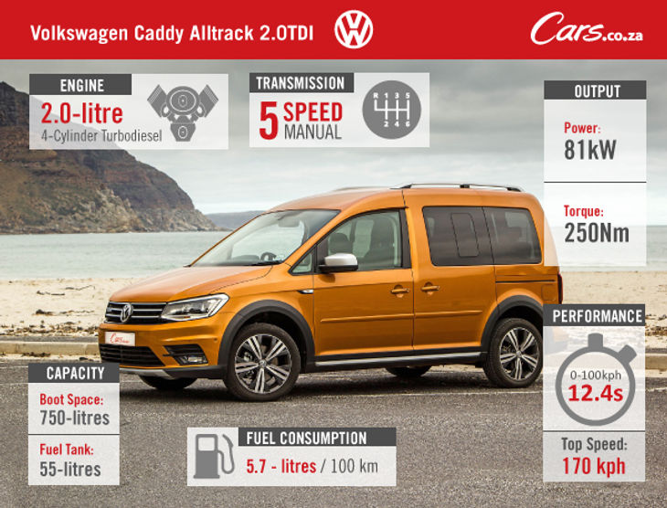 The Volkswagen Caddy Alltrack 2.0 TDI sells for R387 600 and comes backed by a 3-years/120 000 km warranty and 3-years/60 000 km service plan. Service intervals are scheduled for every 15 000 km.