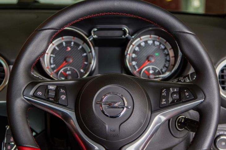 Opel Adam S steering wheel features hands-free communication buttons as well as cruise control with limiter