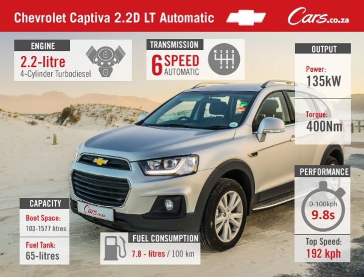 The Chevrolet Captiva 2.2D LT Automatic sells for R431 300 and comes with a five-years/120 000 km vehicle warranty and three-years/60 000 km service plan. It requires servicing every 15 000 km.