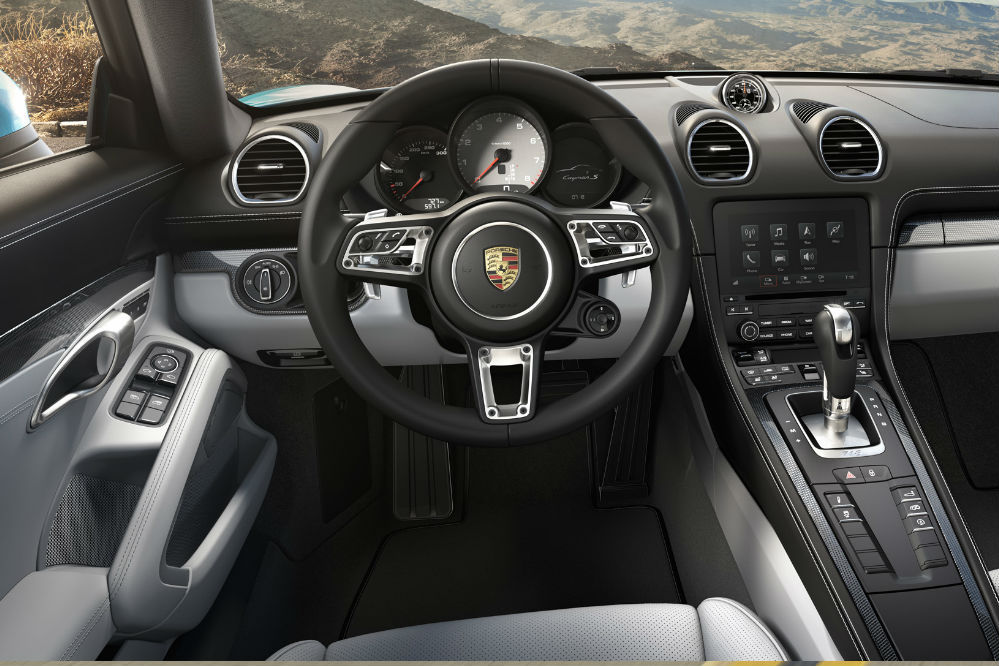 From an aesthetic point of view, the Cayman’s sharper front end features larger air intakes and newly designed bi-xenon headlights with integrated LED daytime running lights. There are more pronounced fenders and side sills and the rear looks wider thanks to an accent strip in high-gloss black with integrated Porsche badge between the tail lights. The new tail lights feature three-dimensional technology and four-brake spot lights, the firm says.