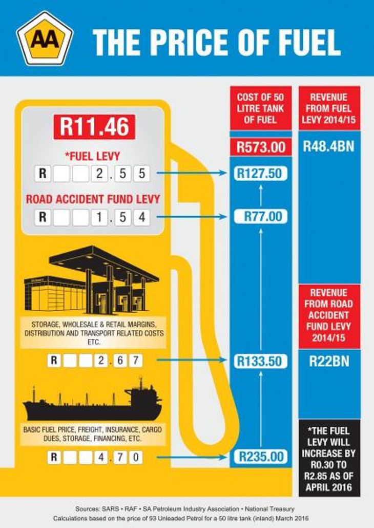 In March 2016, these costs accounted for R6.76 (inland) per litre of 93 unleaded petrol. Of this amount, R2.55 was allocated to the Fuel Levy while R1.54 was allocated to the RAF Levy.